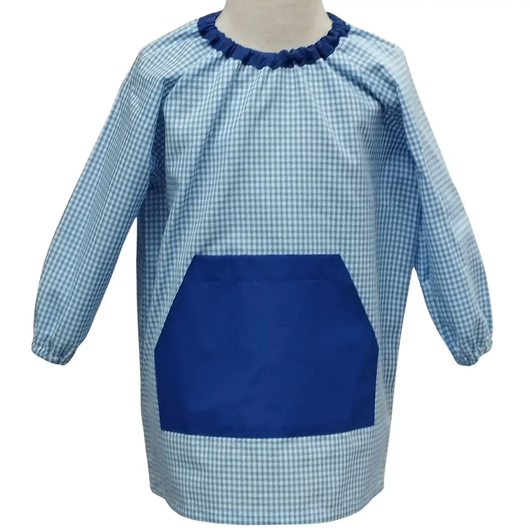Confeccionado en un cuadro pequeño clásico, este modelo incorpora un bolsillo central grande y práctico, perfecto para que los niños puedan guardar pañuelos, pequeños útiles escolares o simplemente mantener sus manitas ocupadas. El babi escolar sin botones incluye goma elástica en puños y cuello, lo que permite que los niños puedan ponérselo y quitárselo con total facilidad, sin necesidad de ayuda. Esta característica lo convierte en una opción excelente para fomentar la independencia desde edades tempranas.