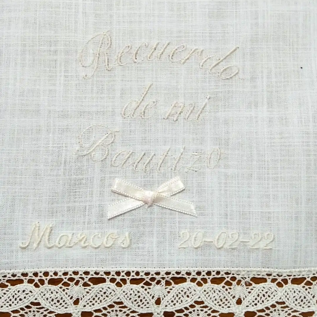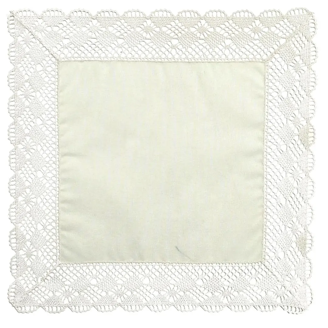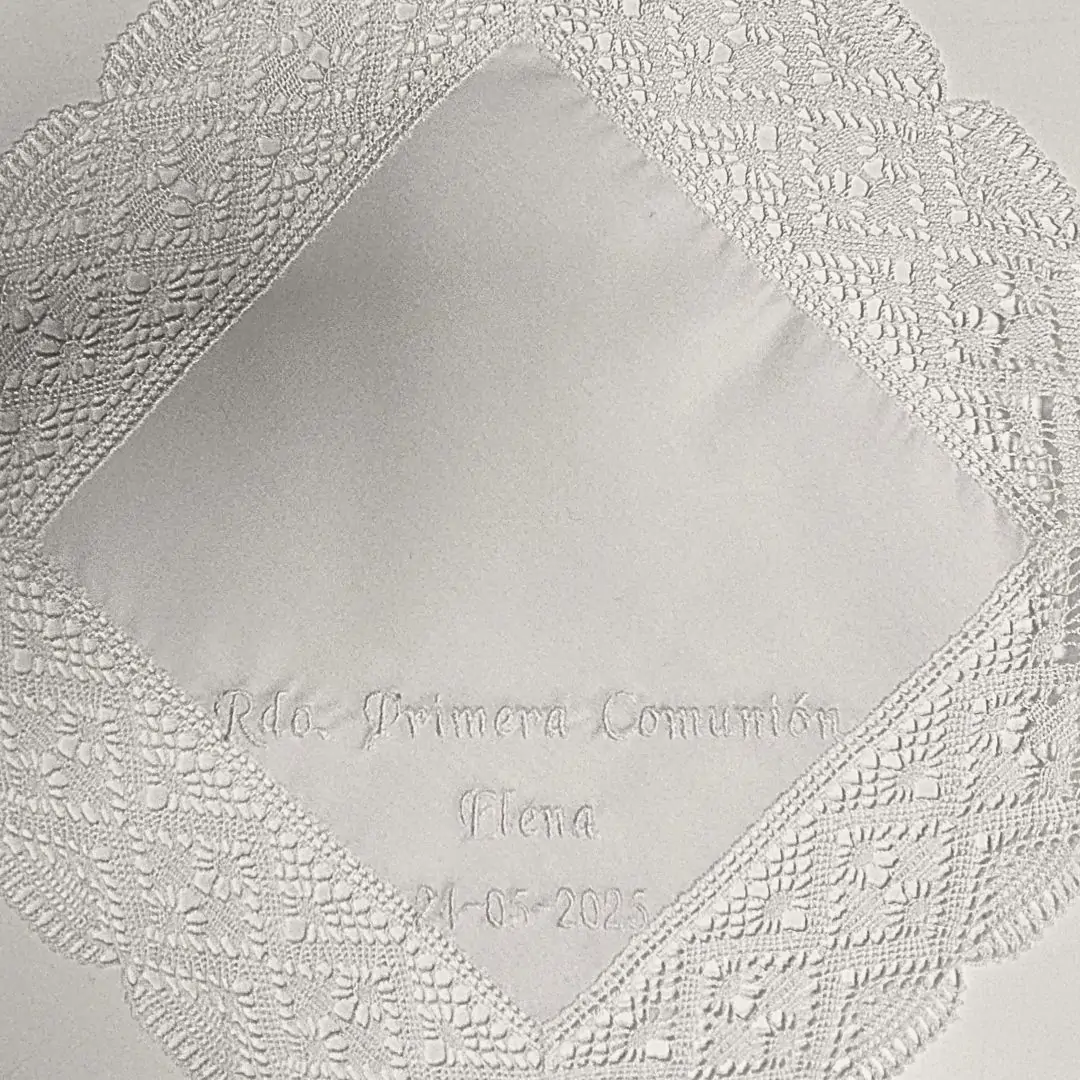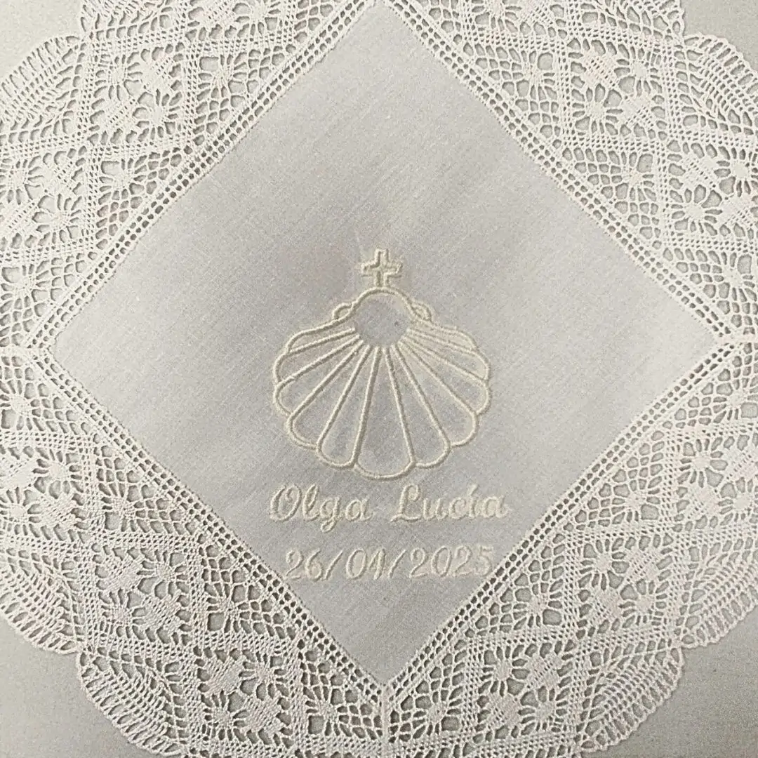 Pañuelo de Bautizo, Comunión o Novias, confeccionado de forma artesanal. Con un tejido fino de batista y rematado con una puntilla de bolillo. Blanco, blanco roto o beig. Se personalizan bordados. Ideal para regalar y guardar como recuerdo.